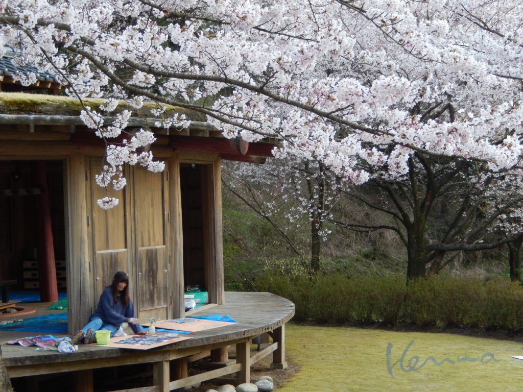表に行くとやっぱりひとりで夜の桜を描いていた